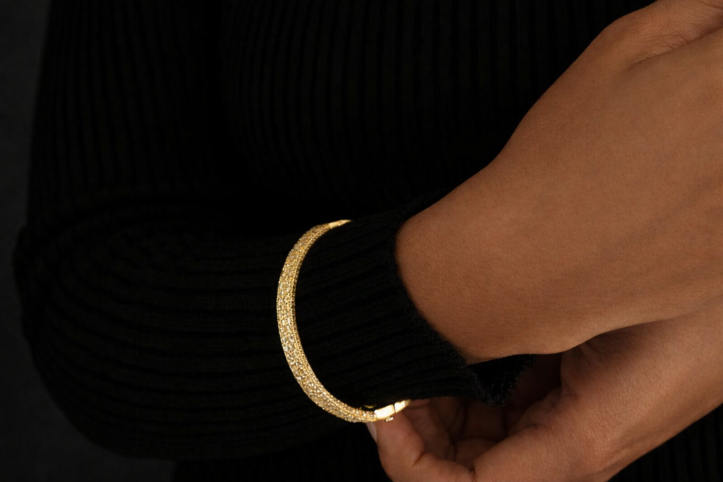 The alternative: A substantial bangle in 18k gold with enough weight to feel significant. A 15-20 gram gold bangle worn on one wrist provides instant polish while maintaining the restraint essential to old money style.